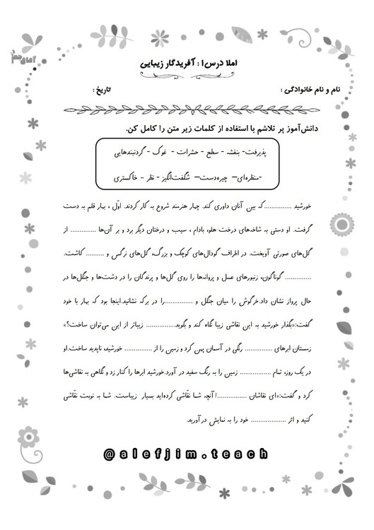 متن درس به صورت خلاصه آورده شده و کلماتی حذف شده اند ، دانش آموز بایستی با استفاده از کلمات داده شده جاهای خالی را کامل کند